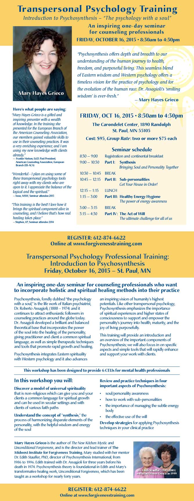 “Psychosynthesis offers depth and breadth to our understanding of the human journey to health, freedom, and purposeful living. This seamless blend of Eastern wisdom and Western psychology offers a timeless vision for the practice of psychology and for the evolution of the human race. Dr. Assagioli’s “smiling wisdom” is ever-fresh.” Mary Hayes Grieco